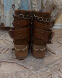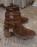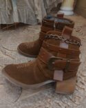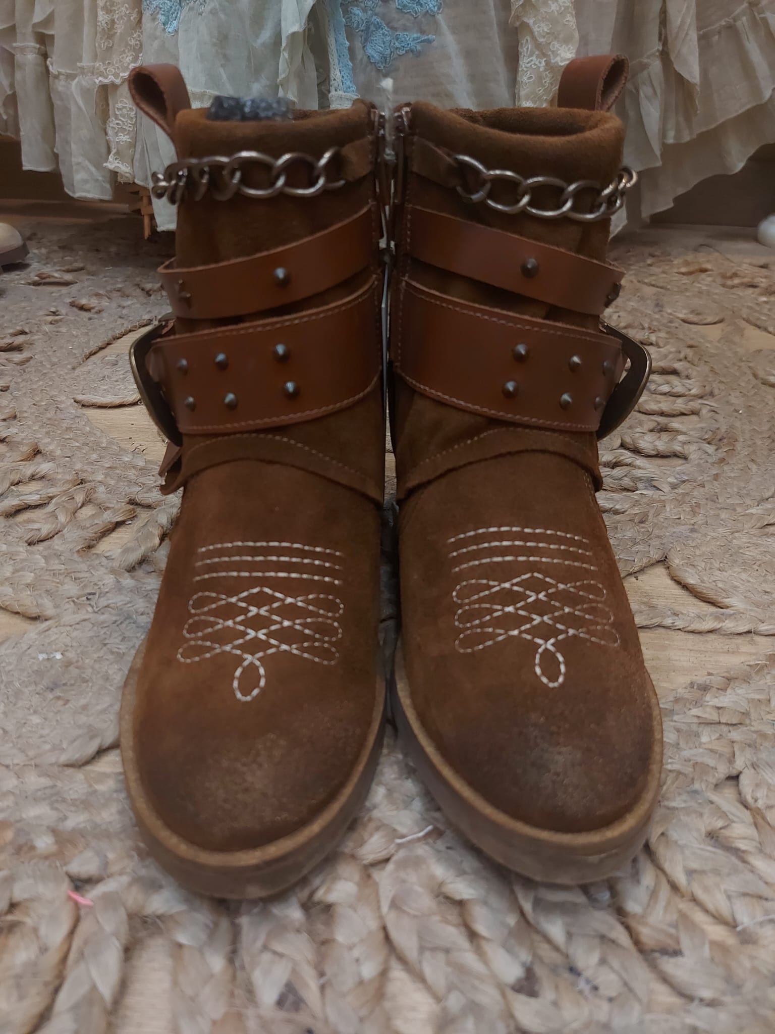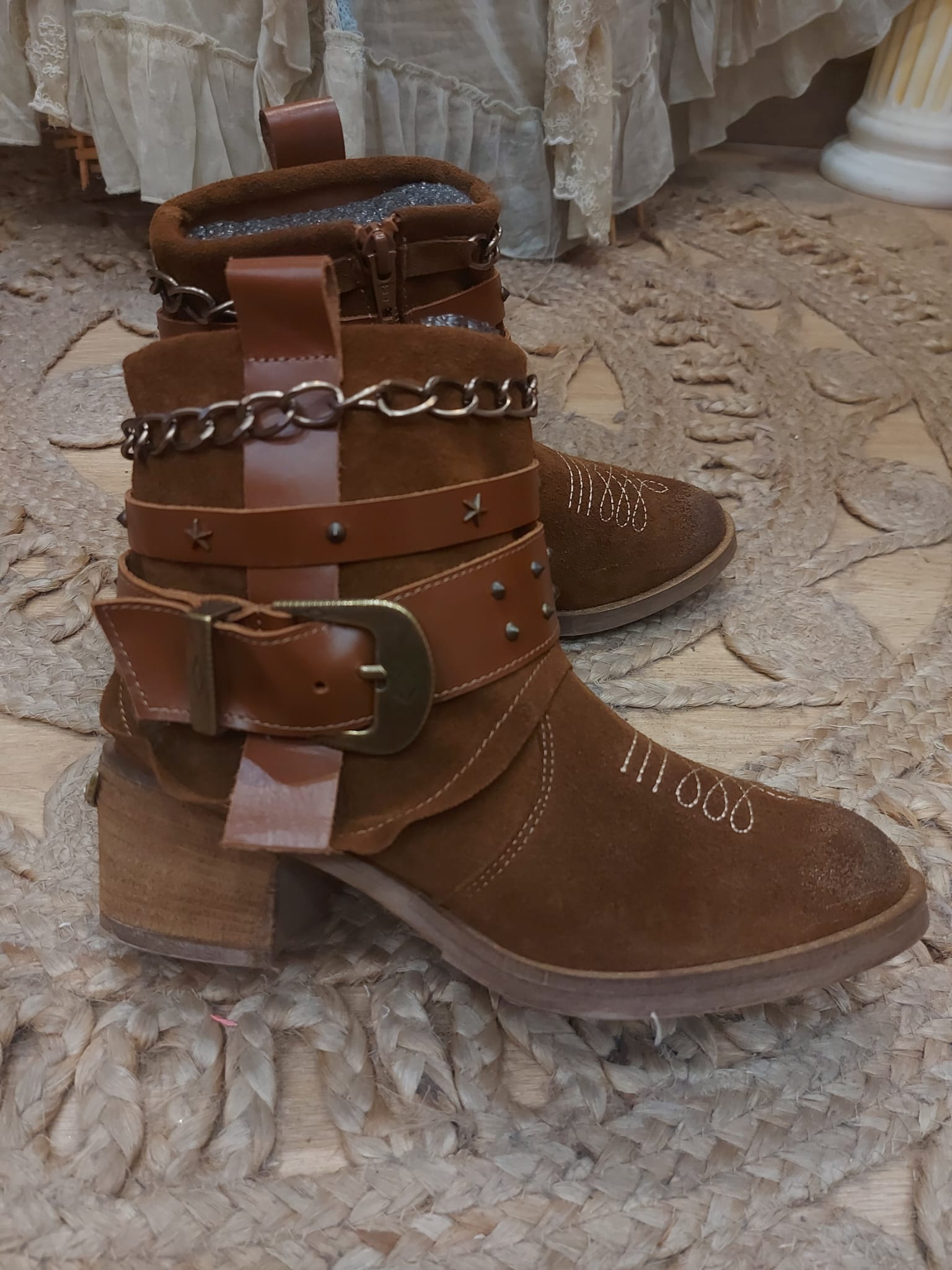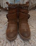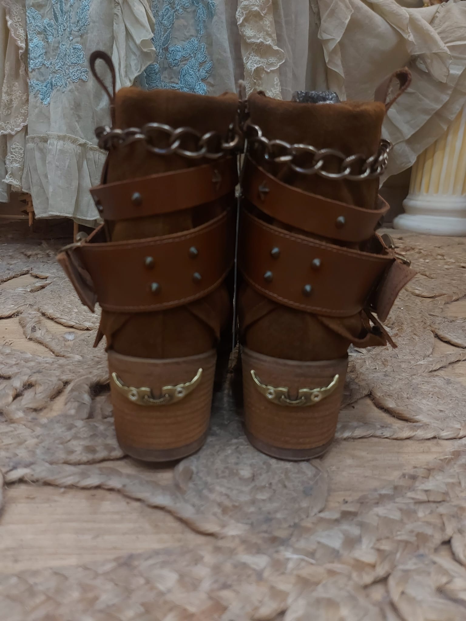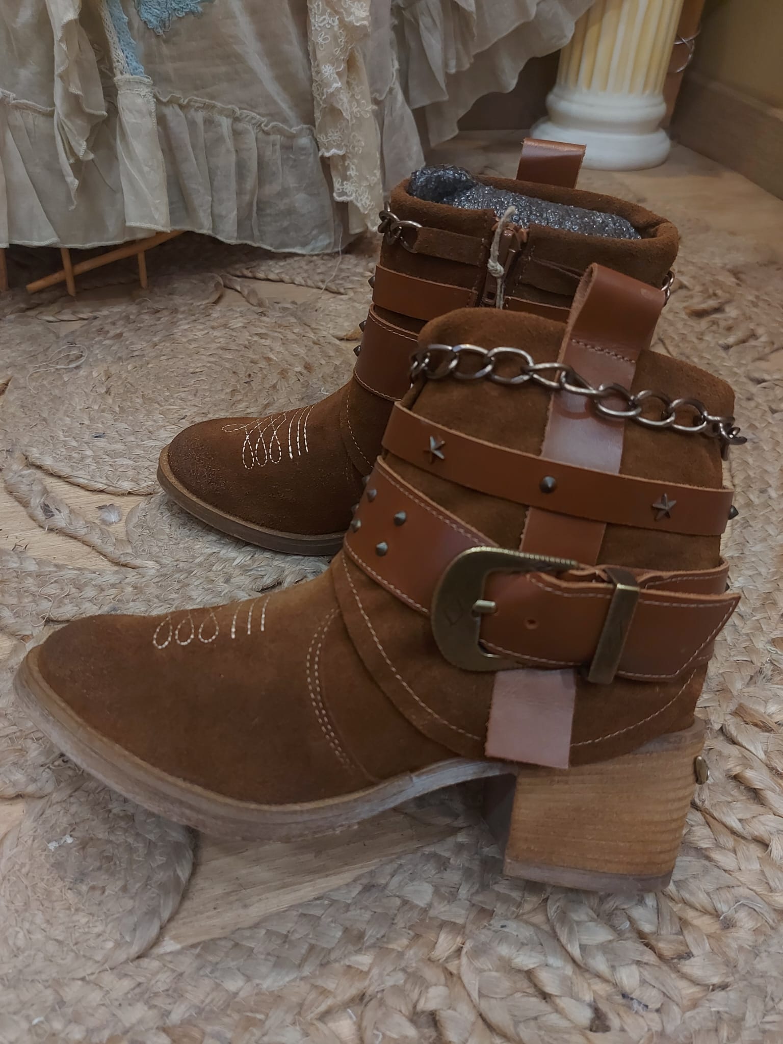 Estilo con Carácter: Su acabado en ante marrón se combina con un juego de correas de cuero, tachuelas de estrella y una cadena metálica que le dan ese aire rebelde pero sofisticado.