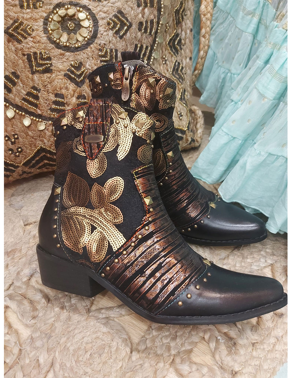 Espectacular botín confeccionado en piel y textil, en color negro y dorado , con puntera puntiaguda y decorado con tachuelas. Cierre con cremallera.
