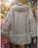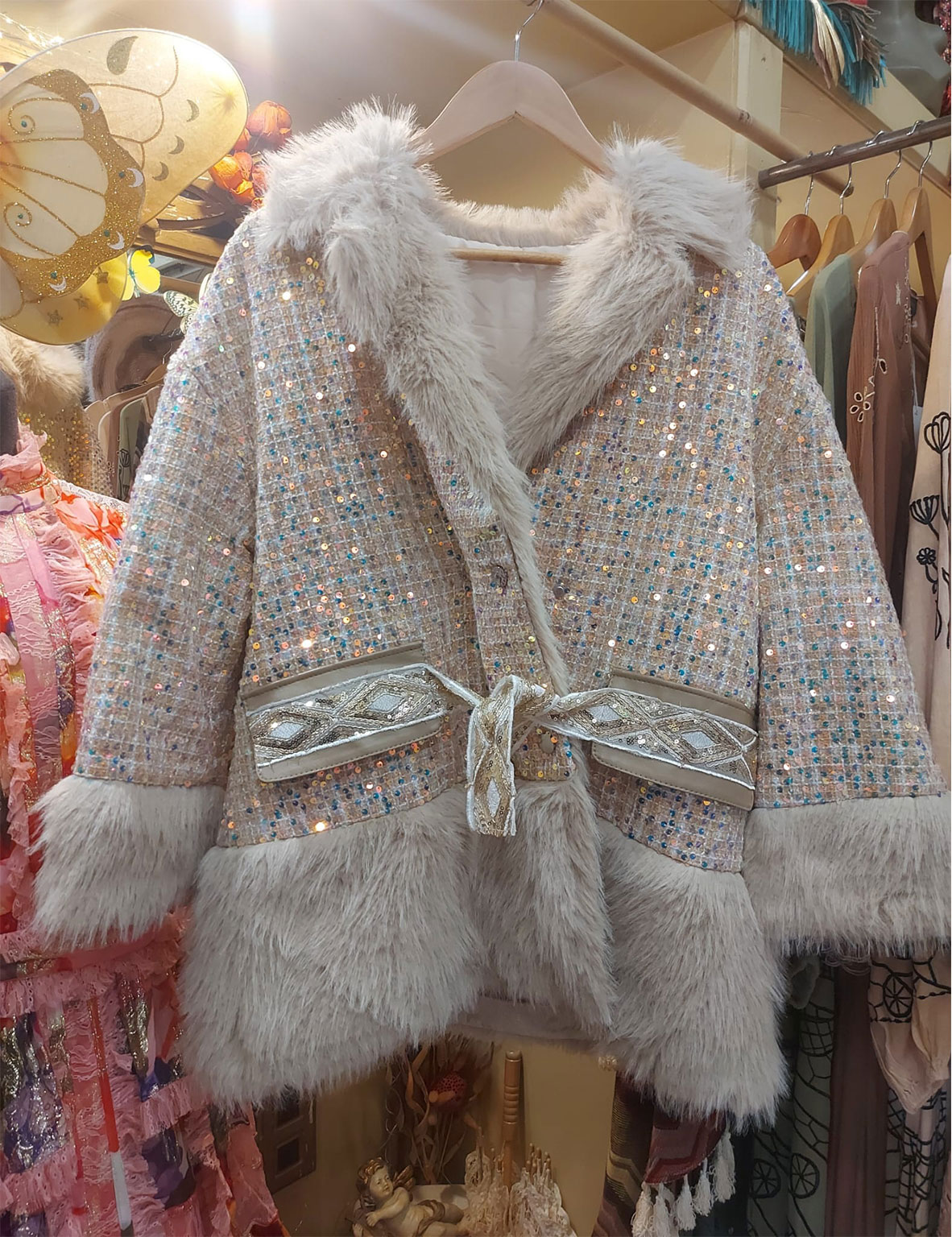 Precioso chaquetón confeccionado en piel sintética y ante, con lentejuelas distribuidas de manera uniforme, por toda la superficie, lo que le da un toque de sofisticación y glamour. Abotonadura central, y bolsillos laterales.