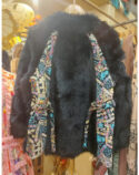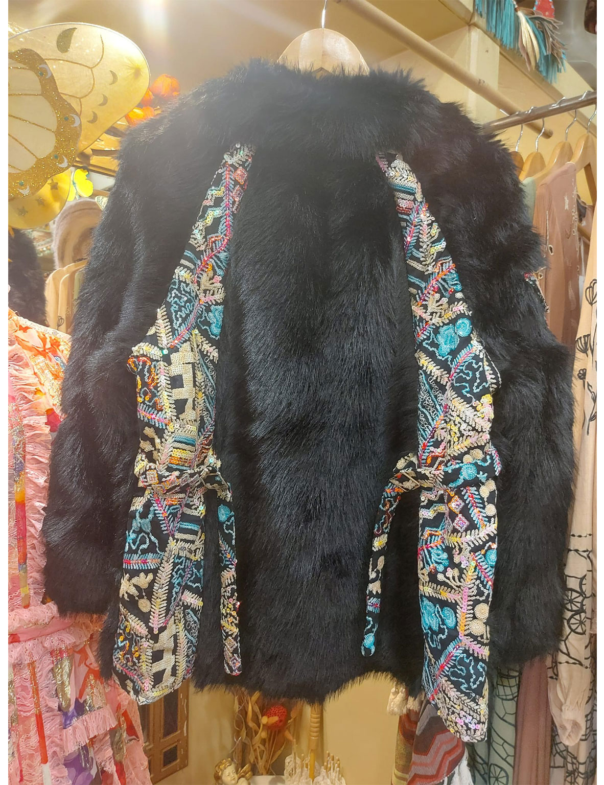 Precioso chaquetón confeccionado en piel sintética, y ante combinado con textil étnico de lentejuelas, lo que le da un toque de sofisticación y glamour. Cremallera central cruzada, y bolsillos laterales.