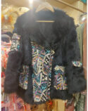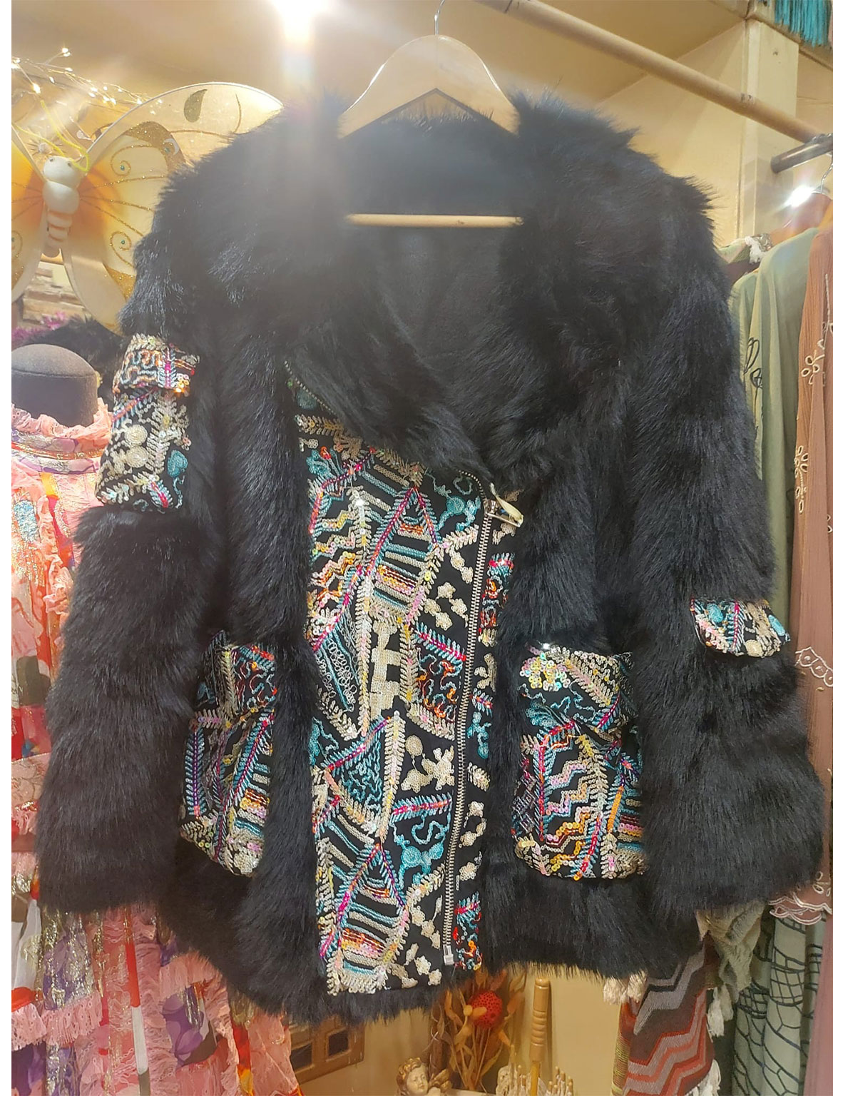 Precioso chaquetón confeccionado en piel sintética y ante, combinado con textil étnico de lentejuelas, lo que le da un toque de sofisticación y glamour. Cremallera central cruzada, y bolsillos laterales.