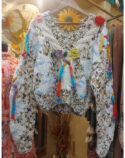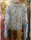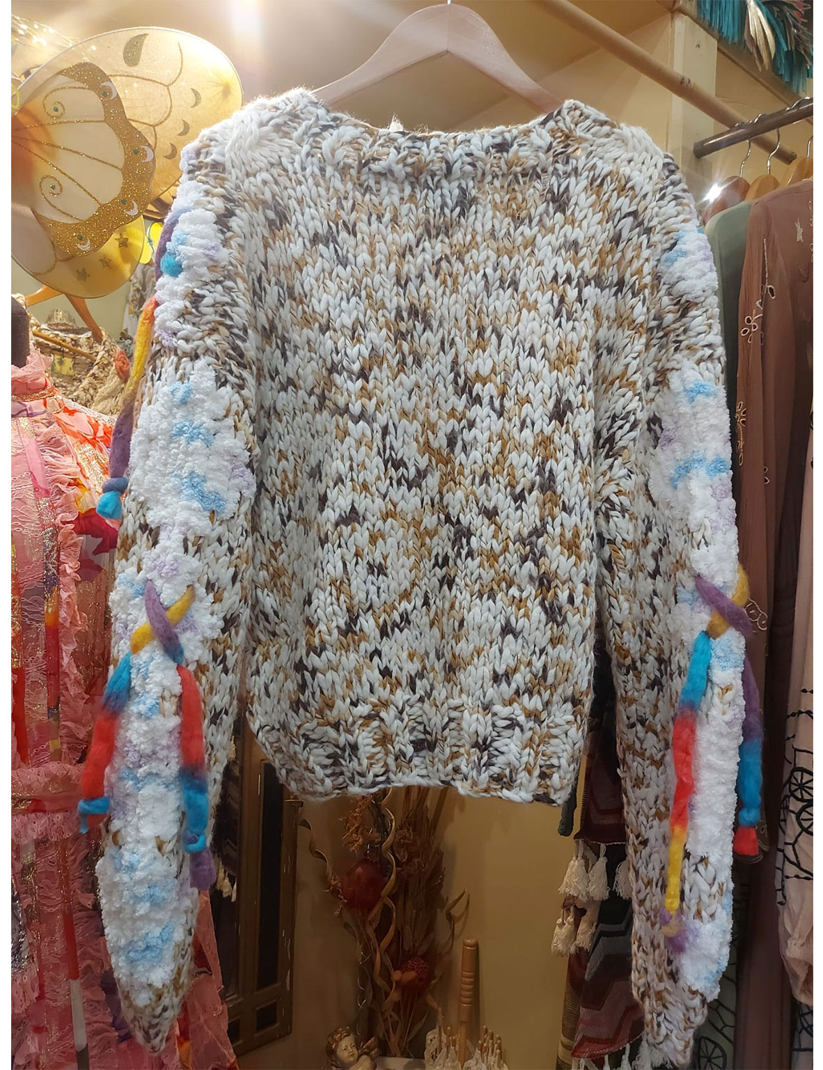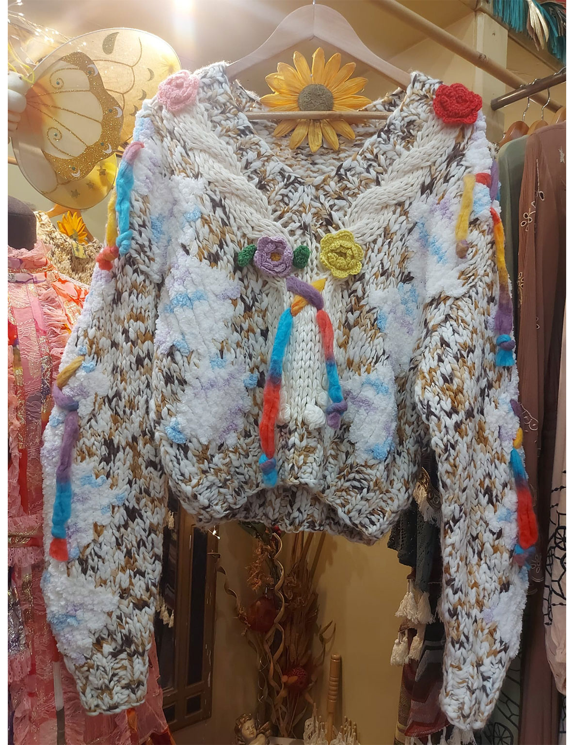 Precioso jersey confeccionada en lana y acrílico, de tacto suave y colorido, con aplicaciones de flores y tiras en relieve.