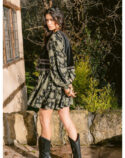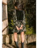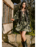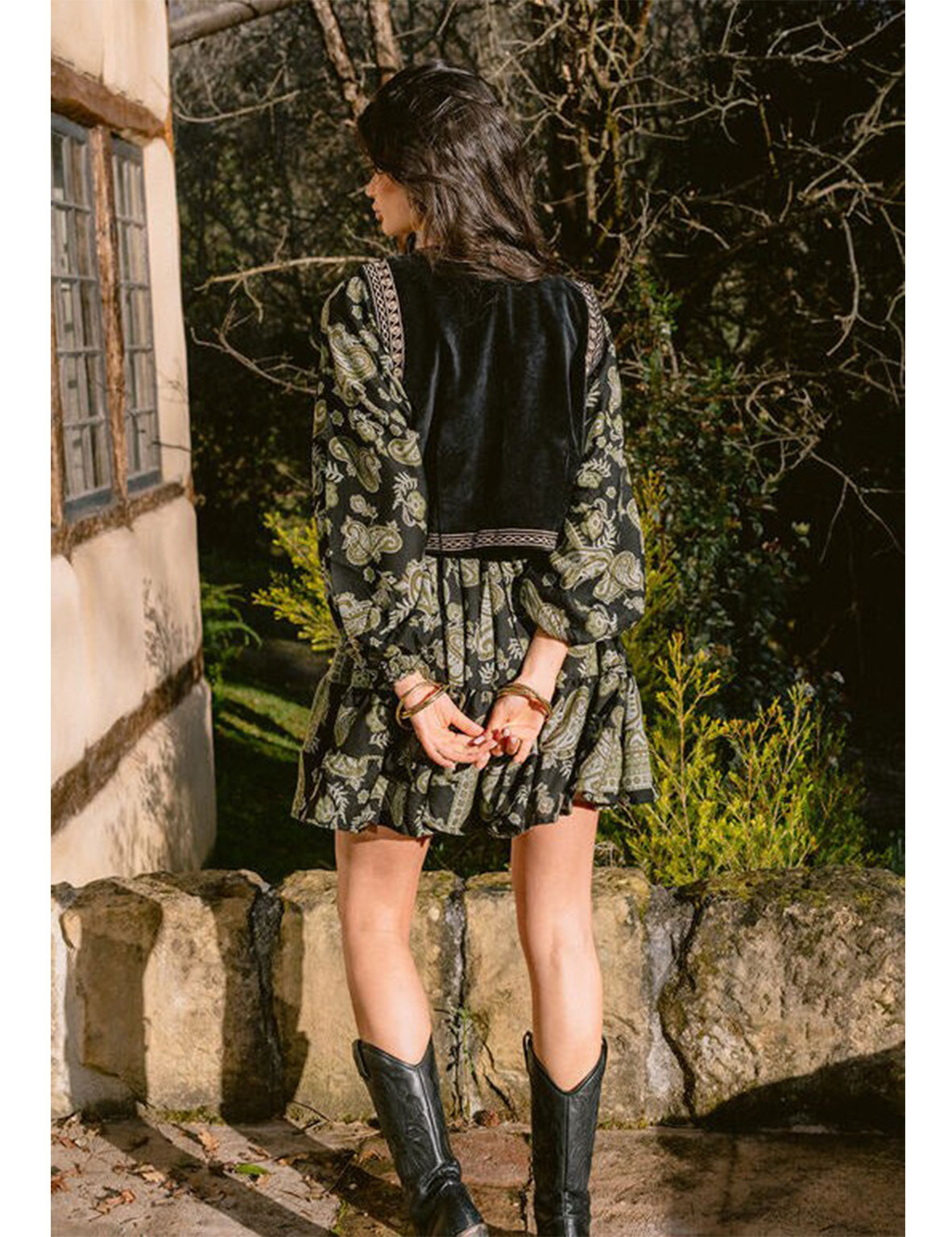 Bonito vestido negro con estampado paisley, en tonos verdes. Escote en pico con volante y manga larga con caída ligera para un aire boho sofisticado.