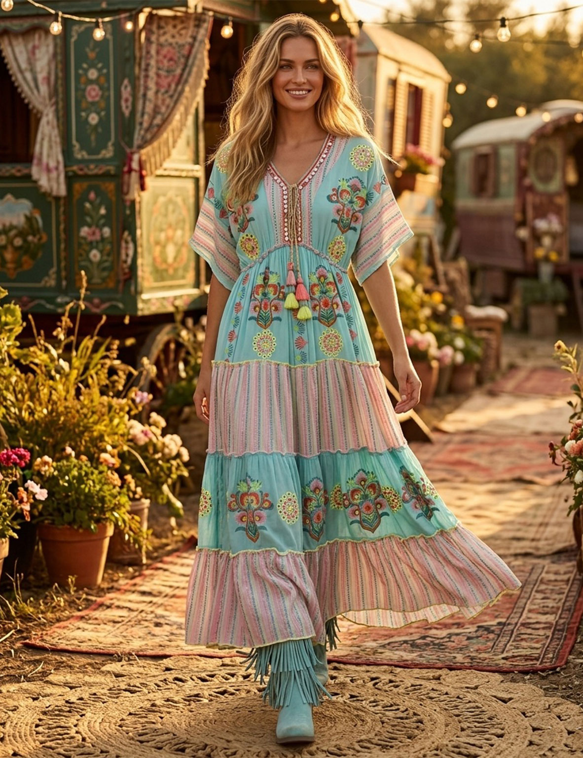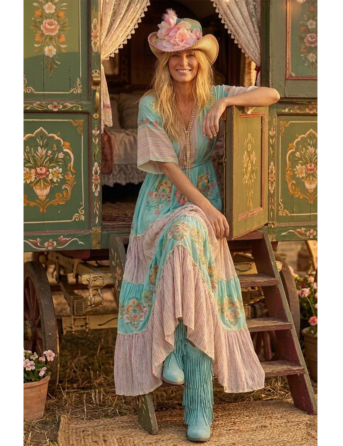 ¡Prepárate para sentir el flechazo! Este no es solo un vestido, es la pieza que estabas buscando para tus días de sol y libertad. Con un tono turquesa, súper refrescante, este maxi vestido de estilo campestre es una explosión de color y detalles hechos con mimo.