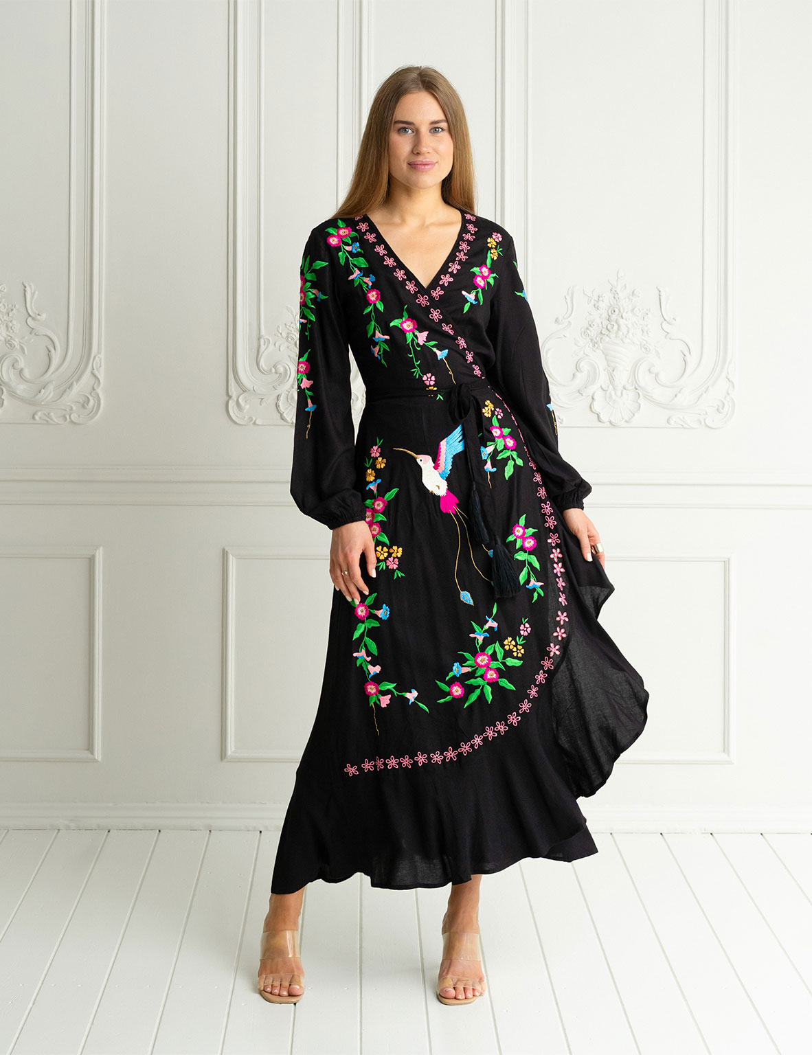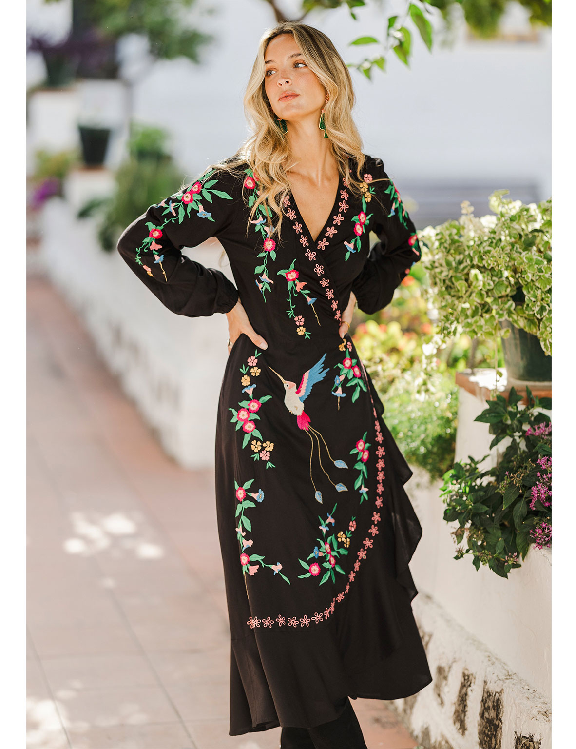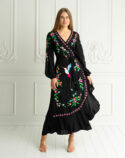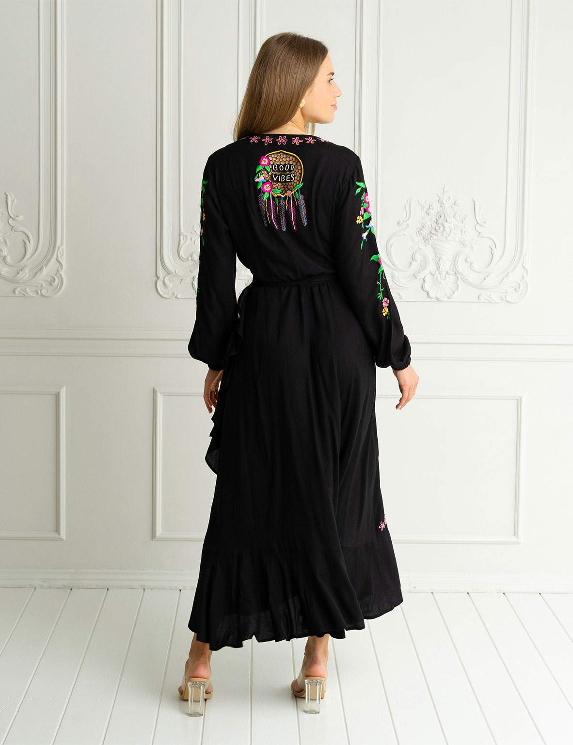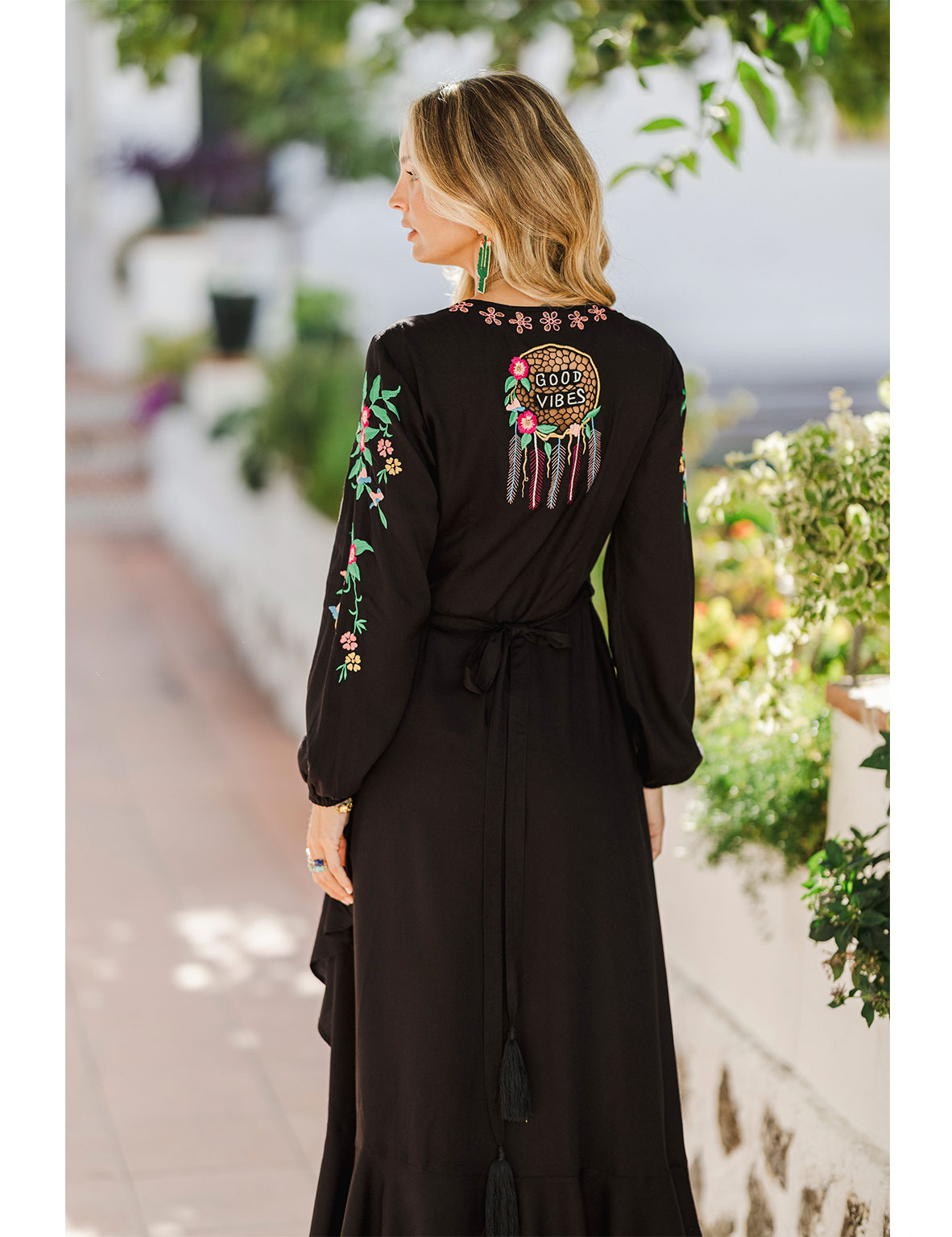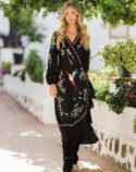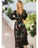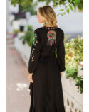 Romance, bohemia y belleza se unen en el Paradise bird, por fin en manga larga. Este maxi vestido presenta un ave del paraíso y un bonito bordado floral, su característico calado y bajos con volantes que le aportan un toque de frescura al caminar. Para el toque final, hemos adornado la espalda con nuestro clásico diseño de atrapasueños en crochet que dice «Buenas Vibras» para transmitir positividad mientras lo llevas puesto.