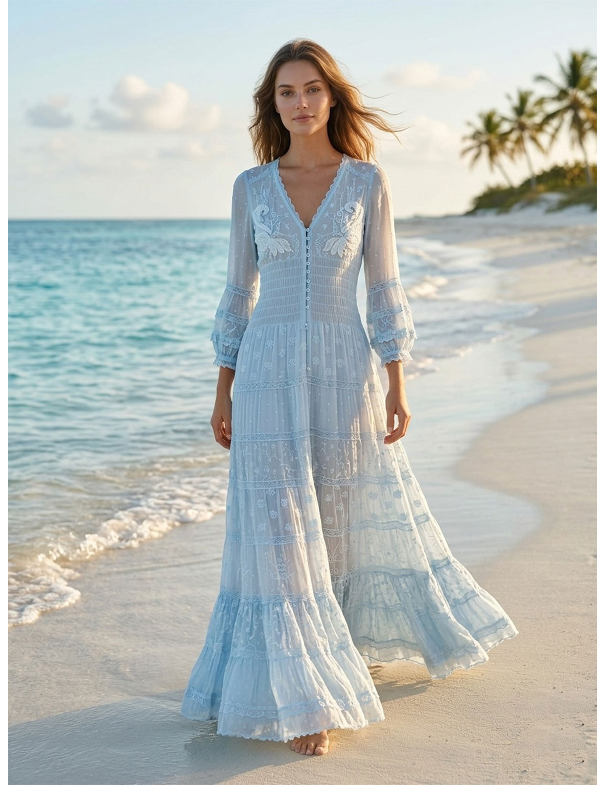Eleva tu estilo con la máxima expresión de elegancia bohemia. Este vestido maxi, confeccionado en un delicado tono azul celeste, está diseñado para quienes buscan una prenda que combine sofisticación, ligereza y un toque artesanal inigualable. Presenta un favorecedor escote en V con un cierre frontal de botones delicadamente dispuestos. El cuerpo incorpora un sutil trabajo de fruncido elástico que define la silueta con delicadeza, y destaca por sus exquisitos apliques florales bordados en la zona superior, que aportan un aire romántico y femenino. La falda presenta un diseño de paneles horizontales con intrincados detalles de encaje y motivos florales bordados sobre un tejido ligero, creando un juego de texturas sutilmente transparente que añade movimiento y profundidad a la prenda.. Sus mangas tres cuartos terminan en puños delicadamente rematados con encaje y volantes, proporcionando un movimiento fluido y etéreo con cada paso.