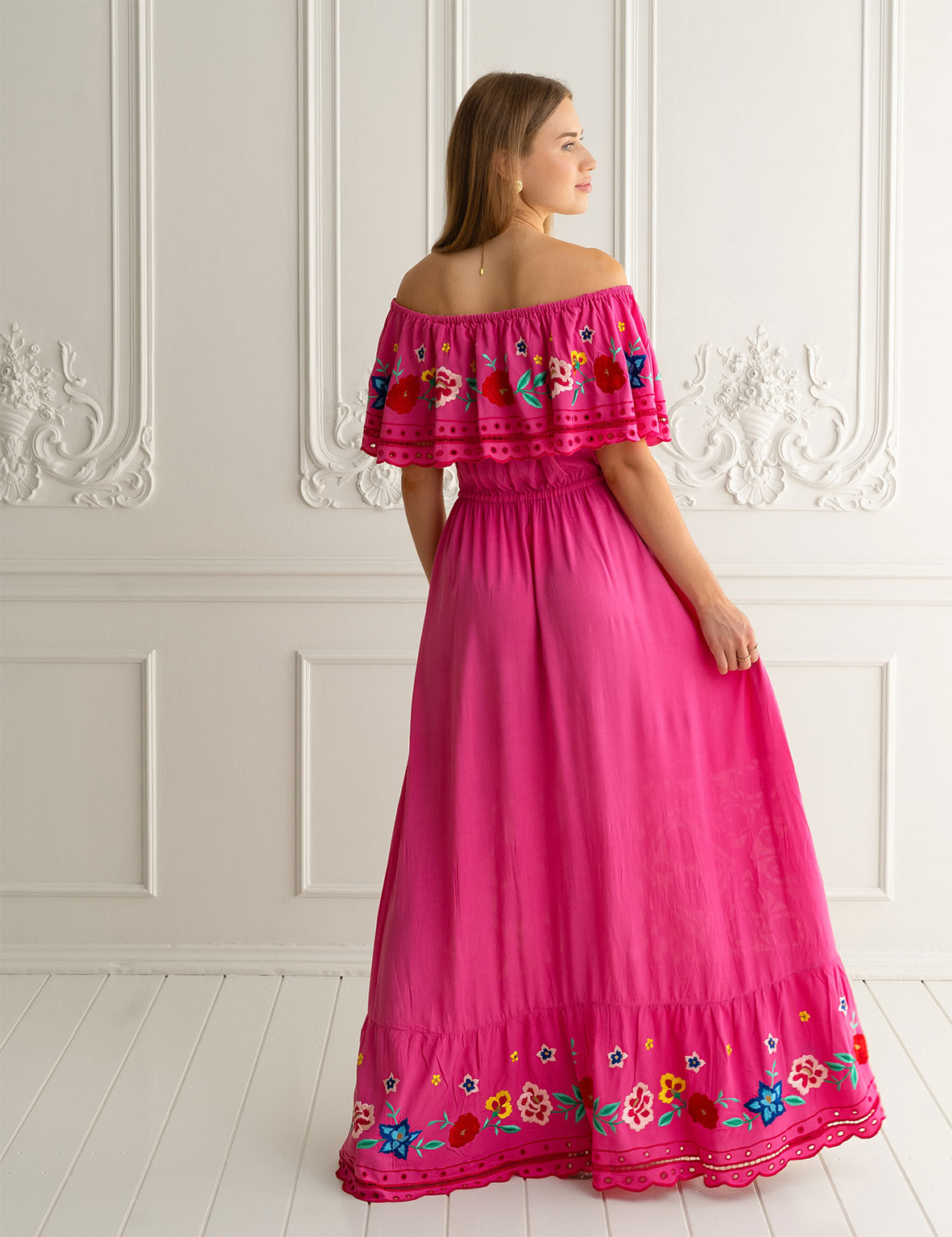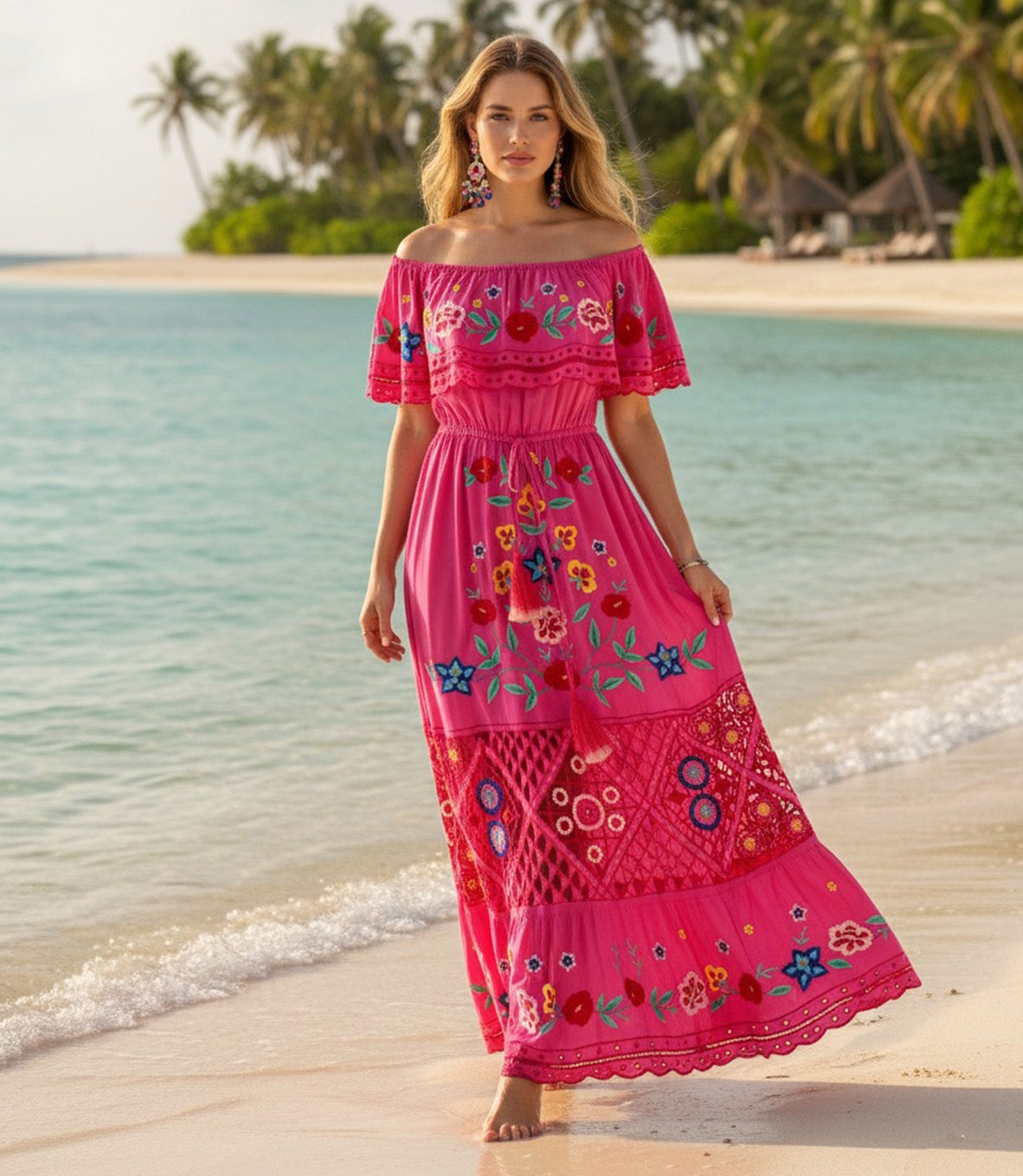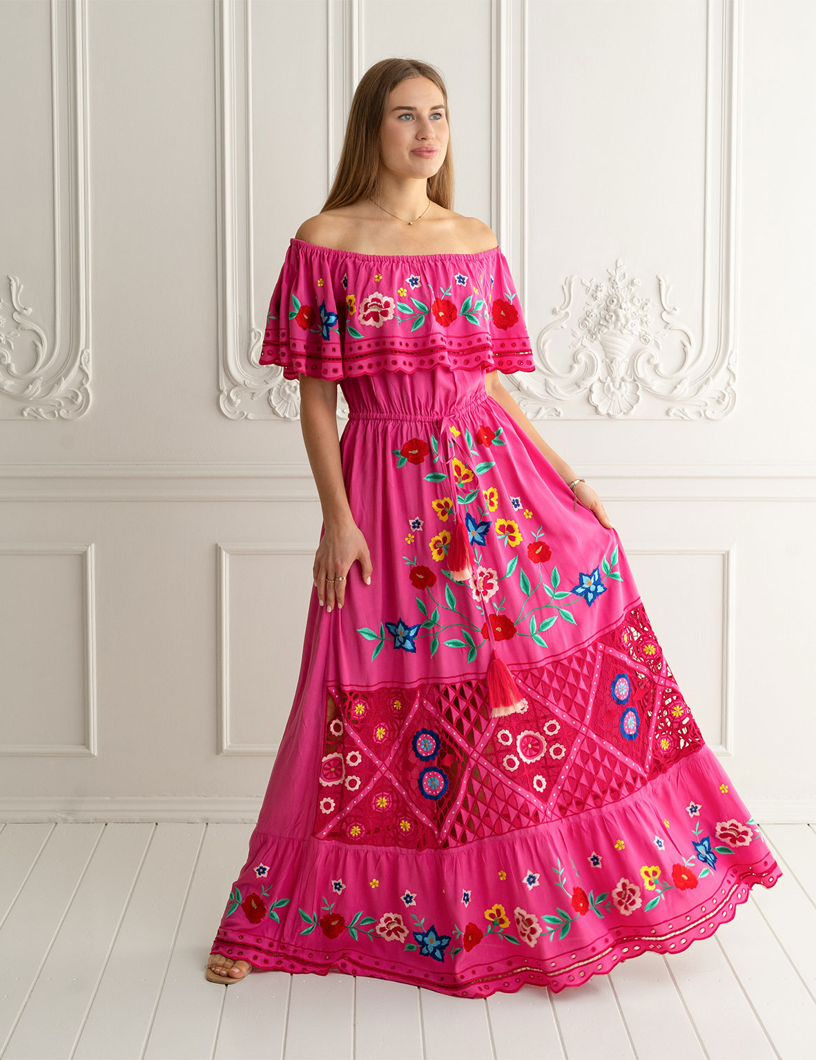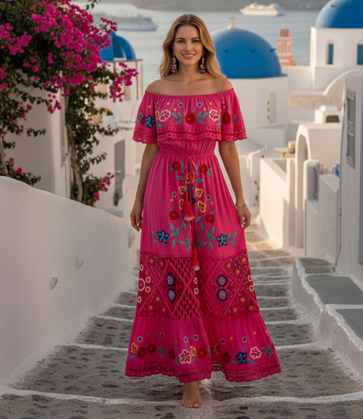Diseñado y confeccionado completamente a mano, se convertirá en tu vestido favorito. Su caída, su naturalidad y su estilo bohemio te enamorarán al instante. El vestido Santorini rose, en color rosa fuerte, combina a la perfección un precioso bordado floral con detalles de ganchillo que irradian elegancia y un toque bohemio desde cualquier ángulo. Con cintura elástica y borlas ajustables que realzan tu figura, esta obra maestra te sentará de maravilla y acaparará todas las miradas. ¡Combínalo con cuñas y joyas llamativas para una noche de fiesta!