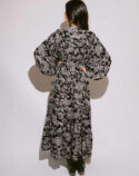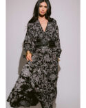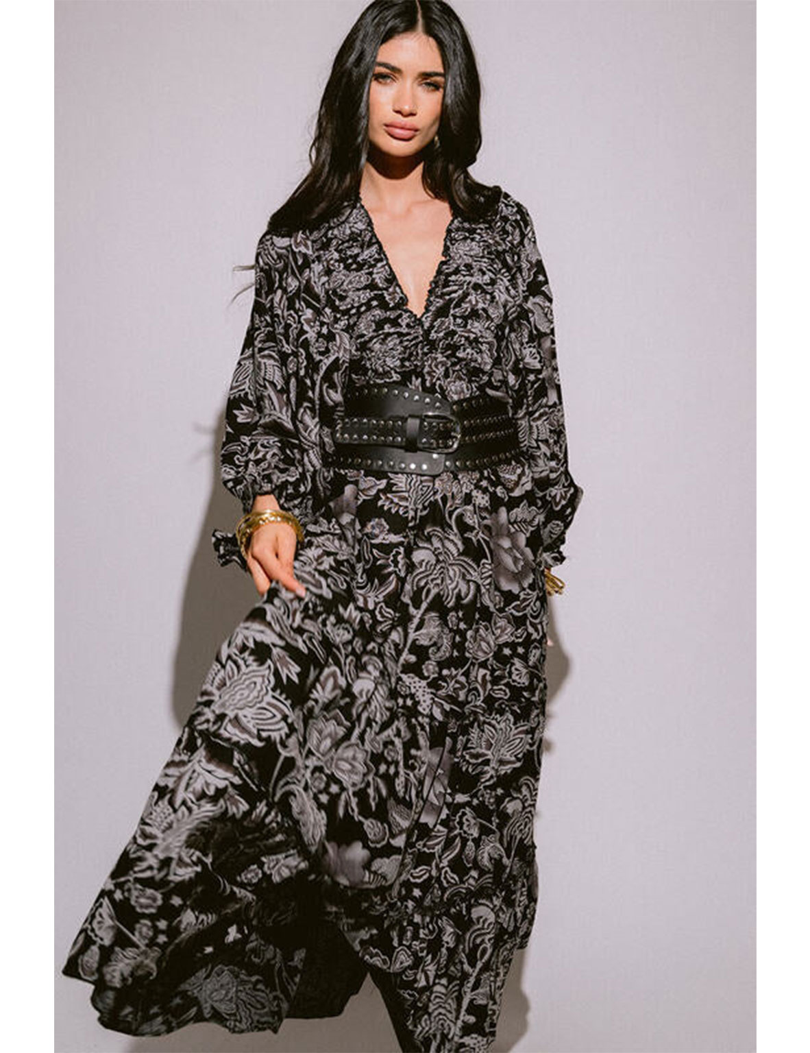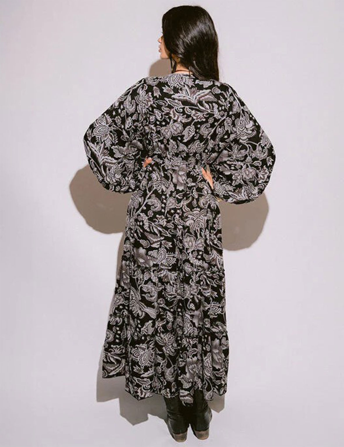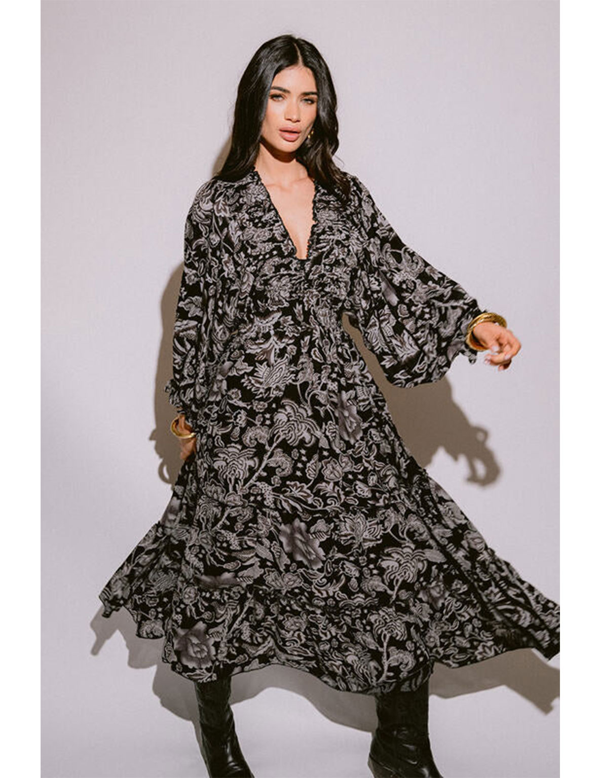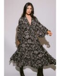 Bonito vestido largo negro confeccionado en viscosa,  con estampado floral en contraste. Tejido fluido y escote en V para un estilo boho elegante y cómodo.